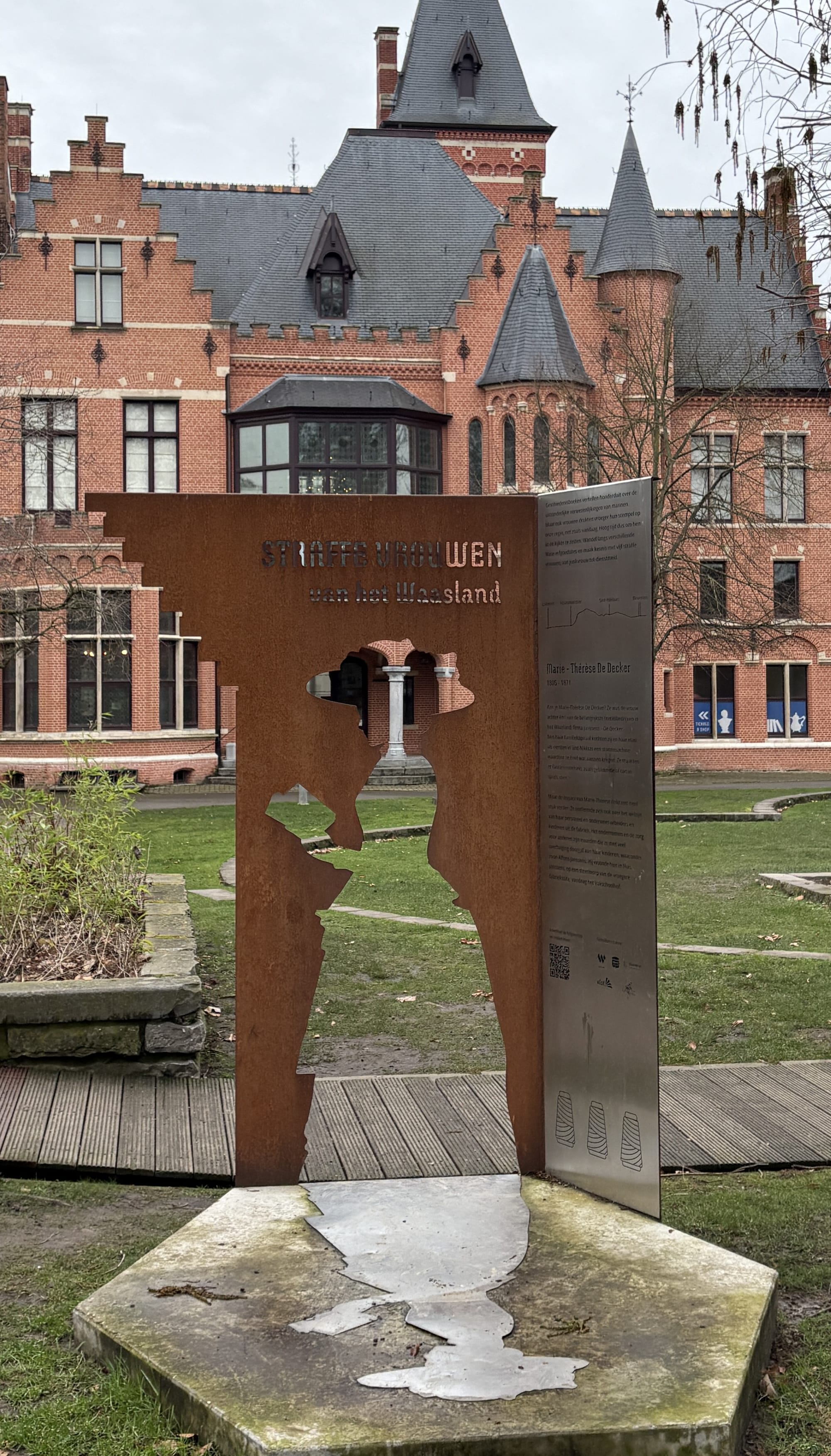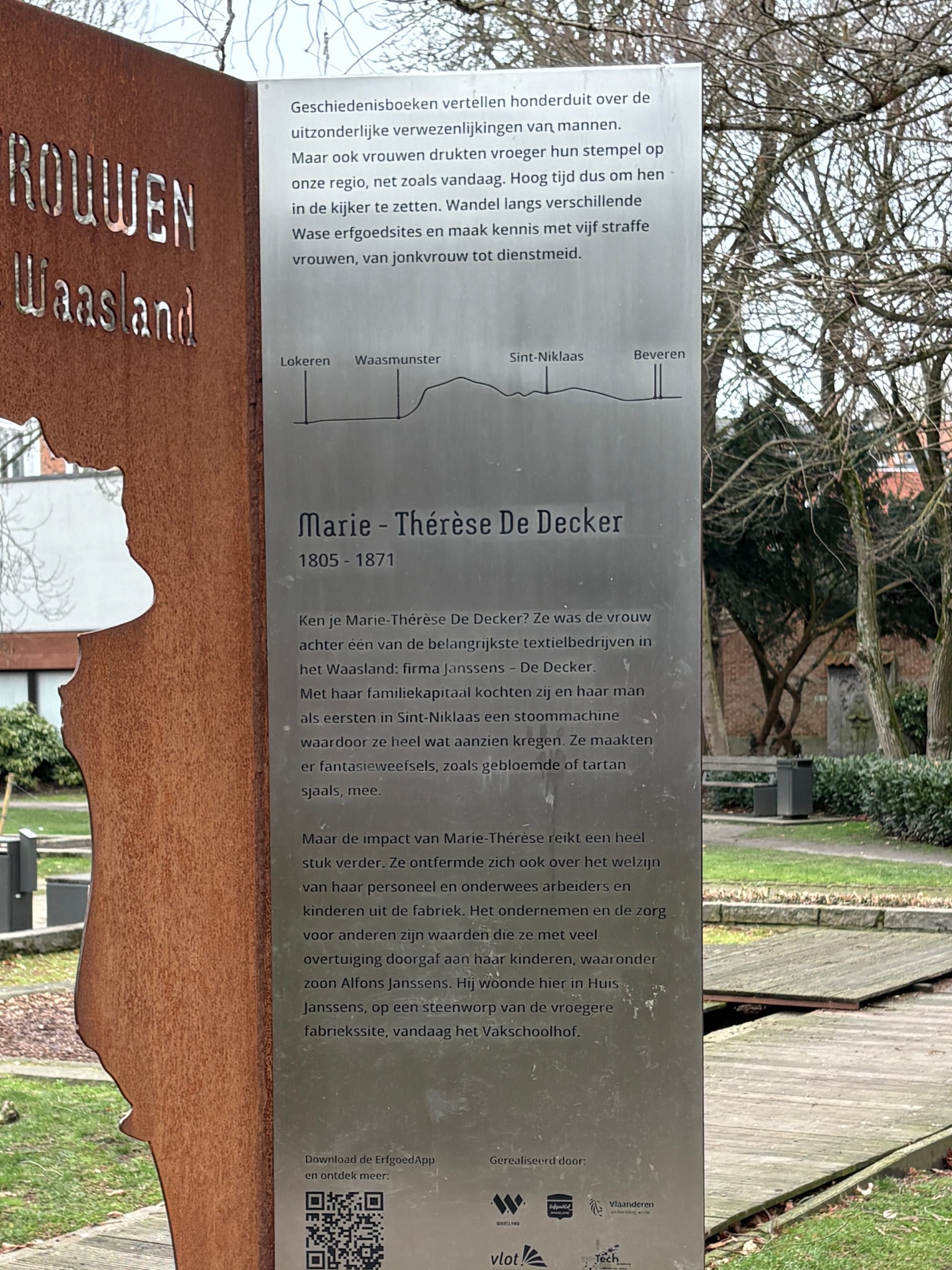 Each location features an interactive silhouette made of Corten steel. You can look through it, walk through it, and stand on it. This allows you to (literally) step into the shoes of these women. Via the ErfgoedApp , you can also learn more about their lives, their choices, and how they held their own in a male-dominated world. You will discover their personal stories and learn more about women's history in general. It is even possible to 'call' the five women from Waasland!